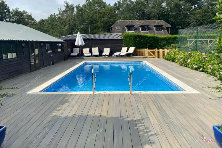 Dengan beragam pilihan warna termasuk abu-abu, kayu muda, dan coklat tua, Necowood membantu arsitek dan desainer menciptakan lingkungan tepi kolam yang modern dan klasik. Dek abu-abu yang dipadukan dengan air kolam biru adalah salah satu kombinasi paling populer dalam proyek perhotelan baru-baru ini.