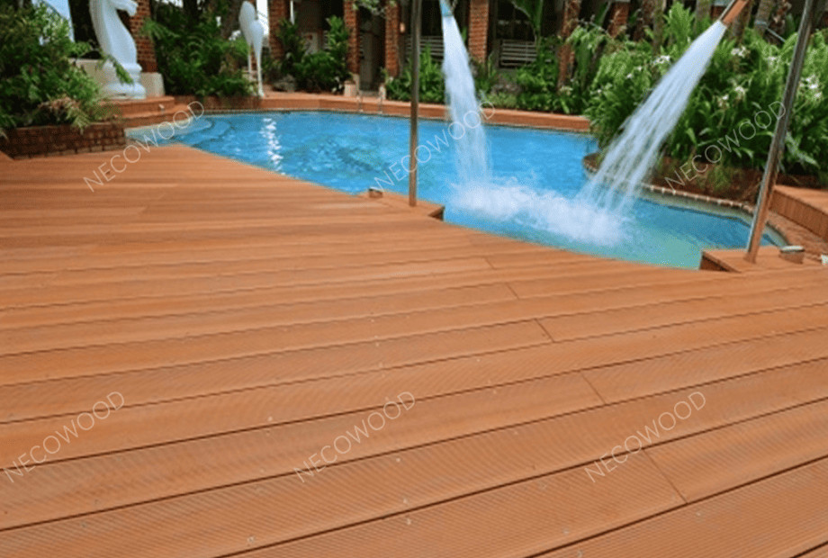 NECOWOOD memproduksipapan decking kayu komposit, decking komposit plastik kayu, Danpenghiasan komposit tertutupdirancang untuk penggunaan di luar ruangan dan di tepi kolam renang.